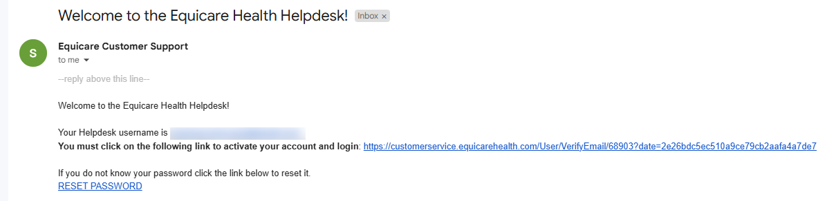 4. You will receive an account activation email with the subject line 'Welcome to the Helpdesk!' from Equicare Customer Support (support@equicarehealth.com).