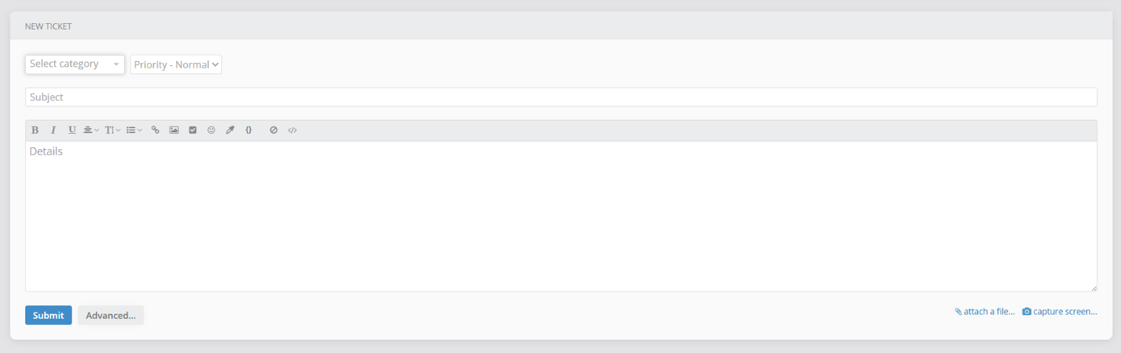 4. You can optionally set the ticket priority and attach files or screenshots to it. The built-in priority levels are "Low", "Normal", "High", and "Critical". You can also add subscribers to the newly created ticket using the "Add subscribers" field on this page - ‘subscribers’ are users who follow the ticket and get all updates from it.